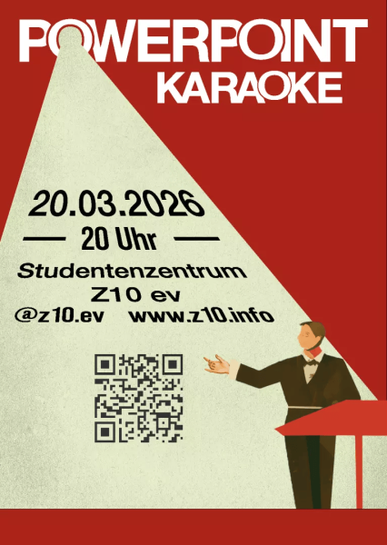 Auch dieses Semester heißt es wieder „Willkommen zu meiner Präsentation" - im Z10 ist wieder Powerpoint-Karaoke Night. Es ist wieder Zeit zu präsentieren, jedoch ohne Vorbereitung! Halte eine Präsentation, die du zuvor noch nicht gesehen hast. Du allein bestimmst den Verlauf durch deine Improvisationskünste. Bist du bereit? Dann Folie ab!Link:https://z10.info